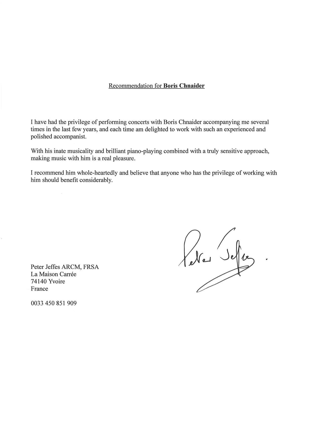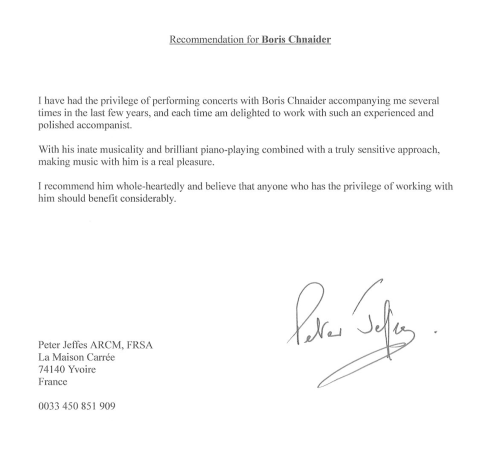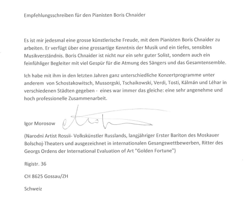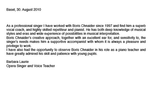 Hiermit bestätige ich, dass Boris Chnaider ein sehr tüchtiger Musiker und sehr guter Pianist ist, der über grosse Kenntnisse sowohl in der Opern- als auch in der Liedliteratur verfügt. Er arbeitet sehr engagiert mit seinen Partnern zusammen und schafft dadurch eine sehr lebendige Atmosphäre.Ich kann ihn bestens weiterempfehlen.